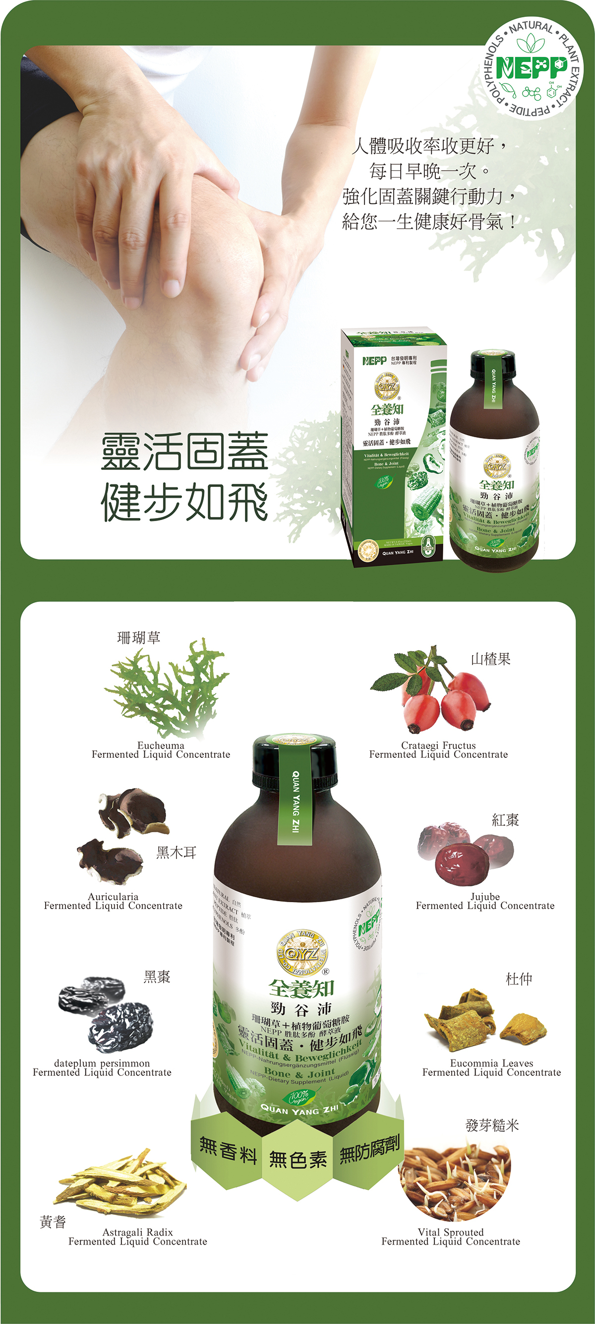 ●成分:珊瑚草發酵液、植物性葡萄糖胺(玉米萃取物)、山楂果發酵液、黑木耳子實體(固態培養)發酵液、紅棗發酵液、黑棗發酵液、杜仲發酵液、黃耆發酵液、生機發芽糙米發酵液、營養添加劑[L-苯丙胺酸、牛磺酸、L-蛋胺酸、L-醋酸離胺酸、L-精胺酸、檸檬酸鈣、葡萄糖酸鎂、膽鈣化醇(維生素D3)]、異麥芽寡糖、植物性乳酸菌、酵母菌
