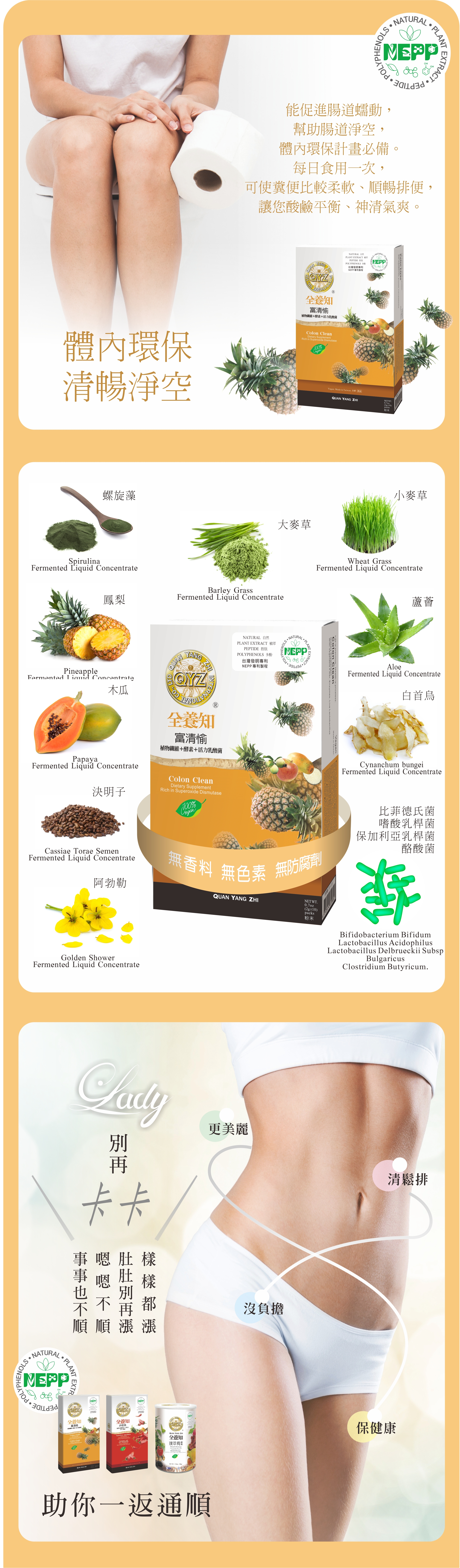 ●成分:螺旋藻、鳳梨發酵濃縮粉、木瓜發酵濃縮粉、決明子、大麥草、小麥草、蘆薈、白首烏、氧化鎂(營養添加劑)、高麗菜、大白菜、芹菜、菠菜、綠藻、荷蘭芹、花椰菜、苦瓜、牛蒡、山藥、生薑、黑木耳子實體(固態培養)、青木瓜、桑椹、山楂葉、野茴香、羊角豆、檸檬草、亞麻仁子、燕麥纖維、純果寡糖、甘草酸鈉(甜味劑)、比菲德氏菌、嗜酸乳桿菌、保加利亞乳桿菌、酪酸菌