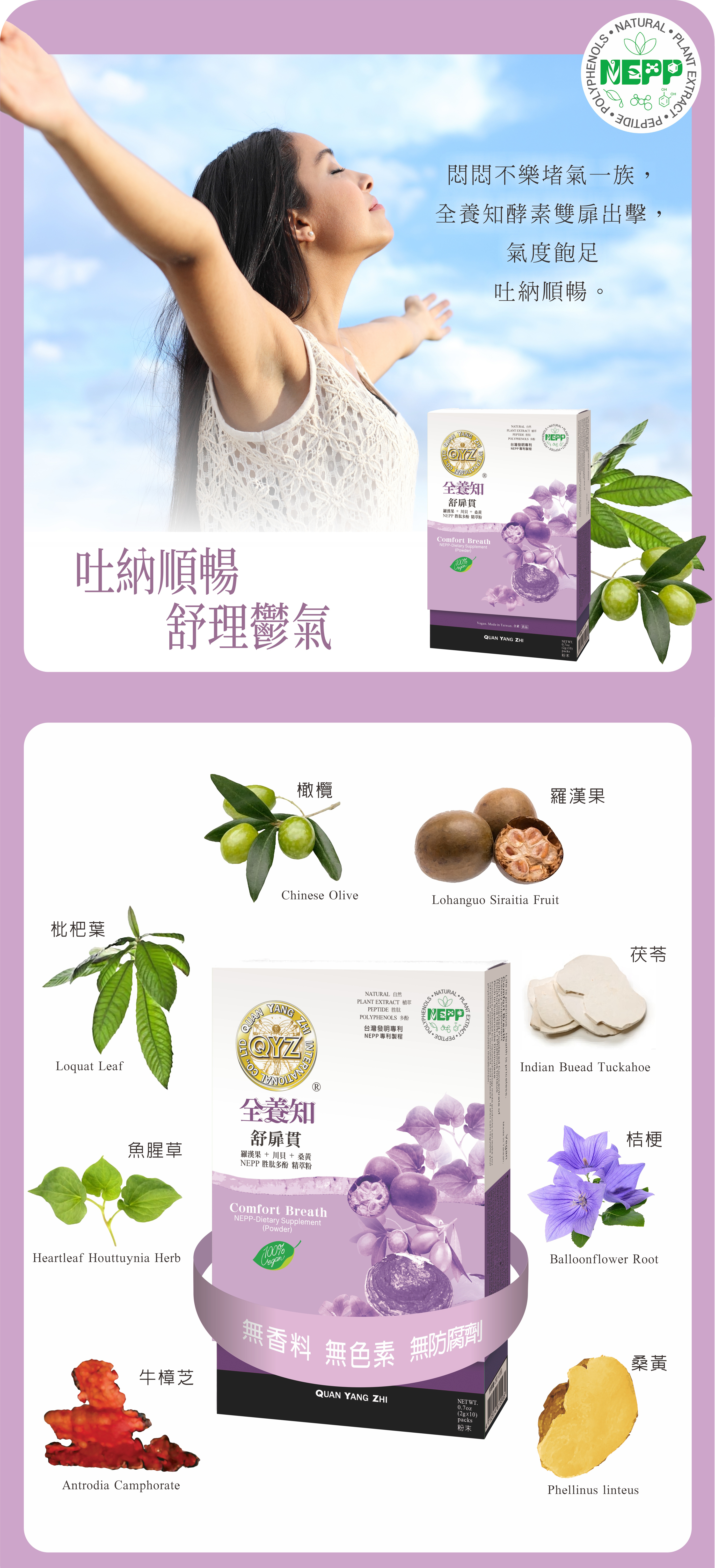 ●成分:羅漢果發酵濃縮粉、橄欖發酵濃縮粉、魚腥草發酵濃縮粉、茯苓發酵濃縮粉、桔梗、桑黃、牛樟芝、白术、甘草、薄荷。