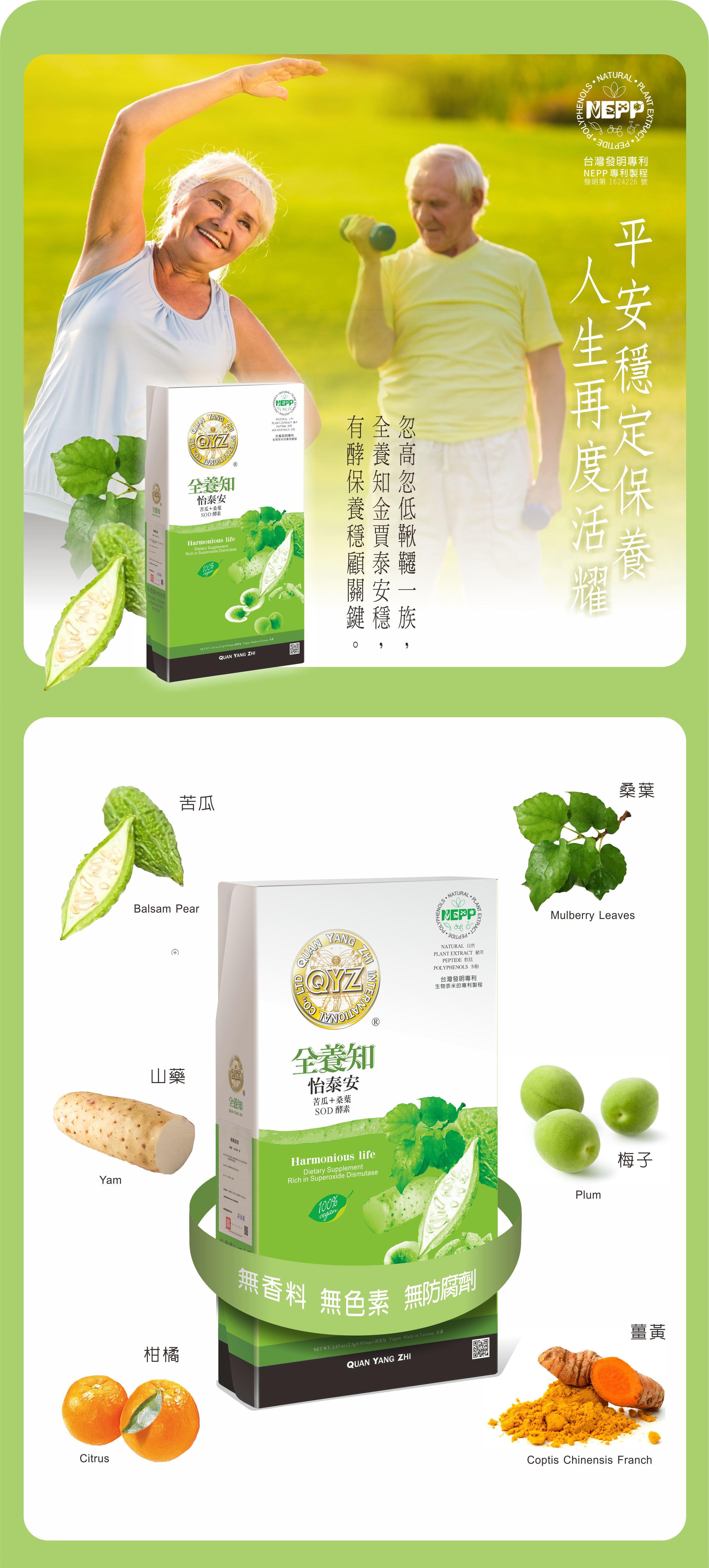 ●成分:苦瓜發酵濃縮粉、桑葉發酵濃縮粉、山藥發酵濃縮粉、梅子發酵濃縮粉、薑黃發酵濃縮粉、柑橘發酵濃縮粉、鉻酵母、桑黃菌絲體(固態培養)、武靴葉、OPC(葡萄籽萃取) 、納豆激酶、牛樟芝菌絲體(固態培養)、肉桂、甘草粉、黃連、紫花苜蓿濃縮粉、人參。