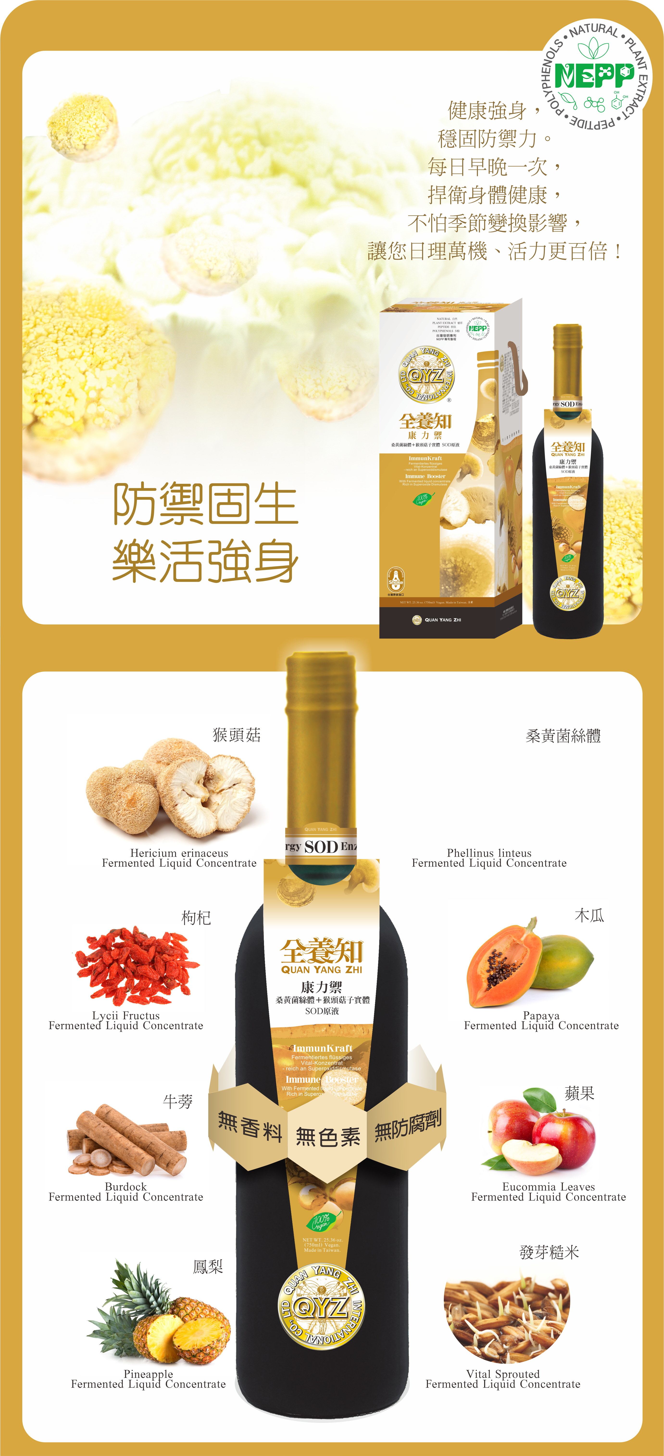 ●成分:猴頭菇子實體(固態培養)發酵液、桑黃菌絲體(固態培養)、牛蒡發酵液、枸杞發酵液、木瓜發酵液、蘋果發酵液、鳳梨發酵液、生機發芽糙米發酵液、異麥芽寡糖、植物性乳酸菌、酵母菌