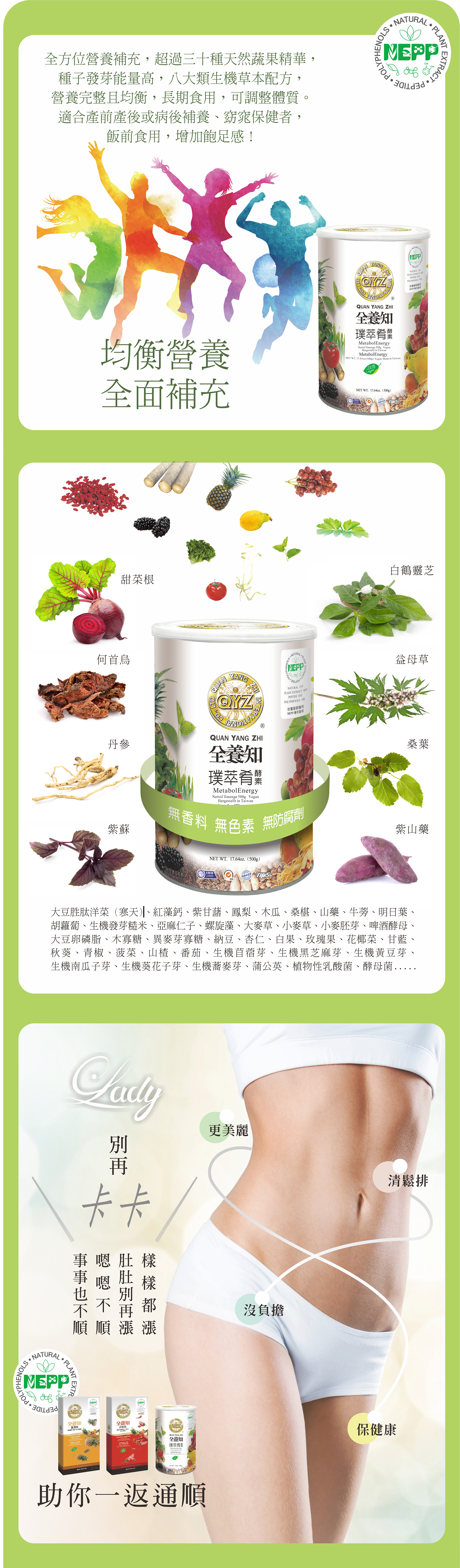 ●成分:甜菜根、白首烏、白鶴靈芝、丹參、紫蘇、益母草、桑葉、紫山藥(紅薯)、紫甘藷、大豆胜 、洋菜(寒天)、紅藻鈣、鳳梨酵萃粉、木瓜酵萃粉、桑椹酵萃粉、山藥酵萃粉、