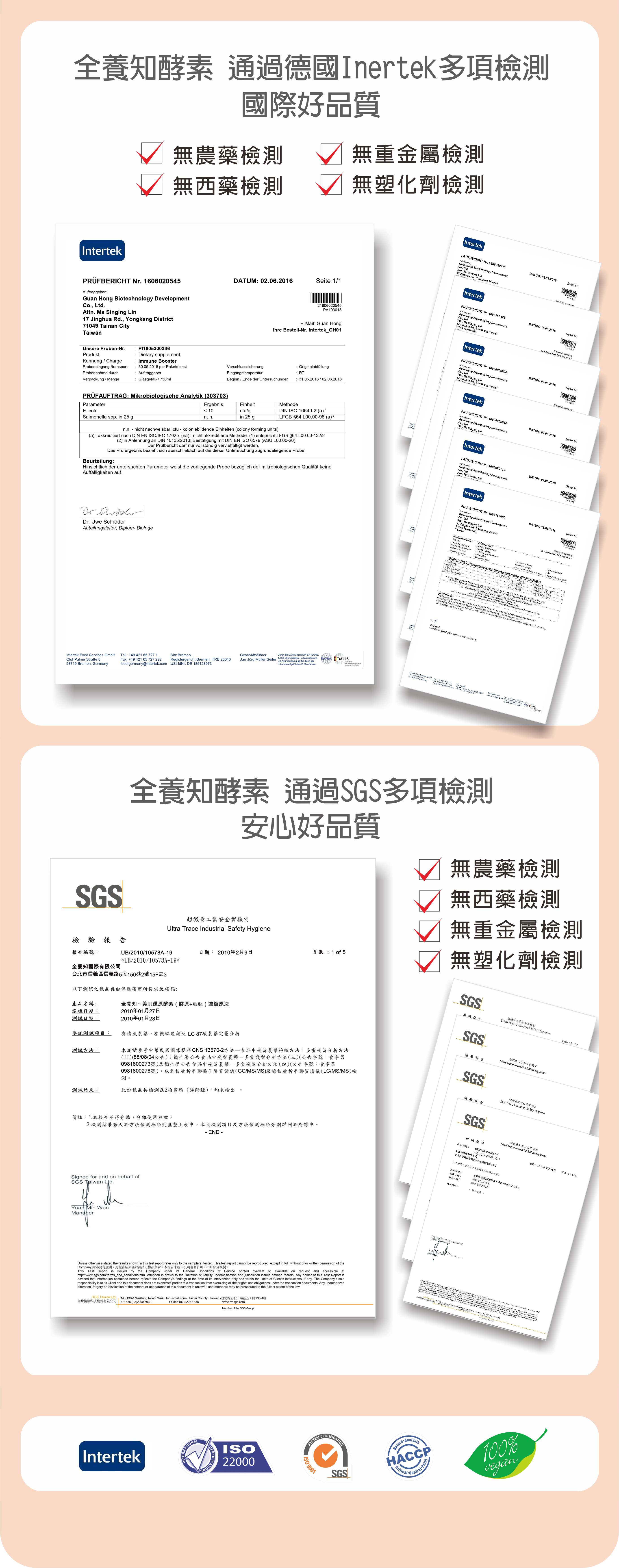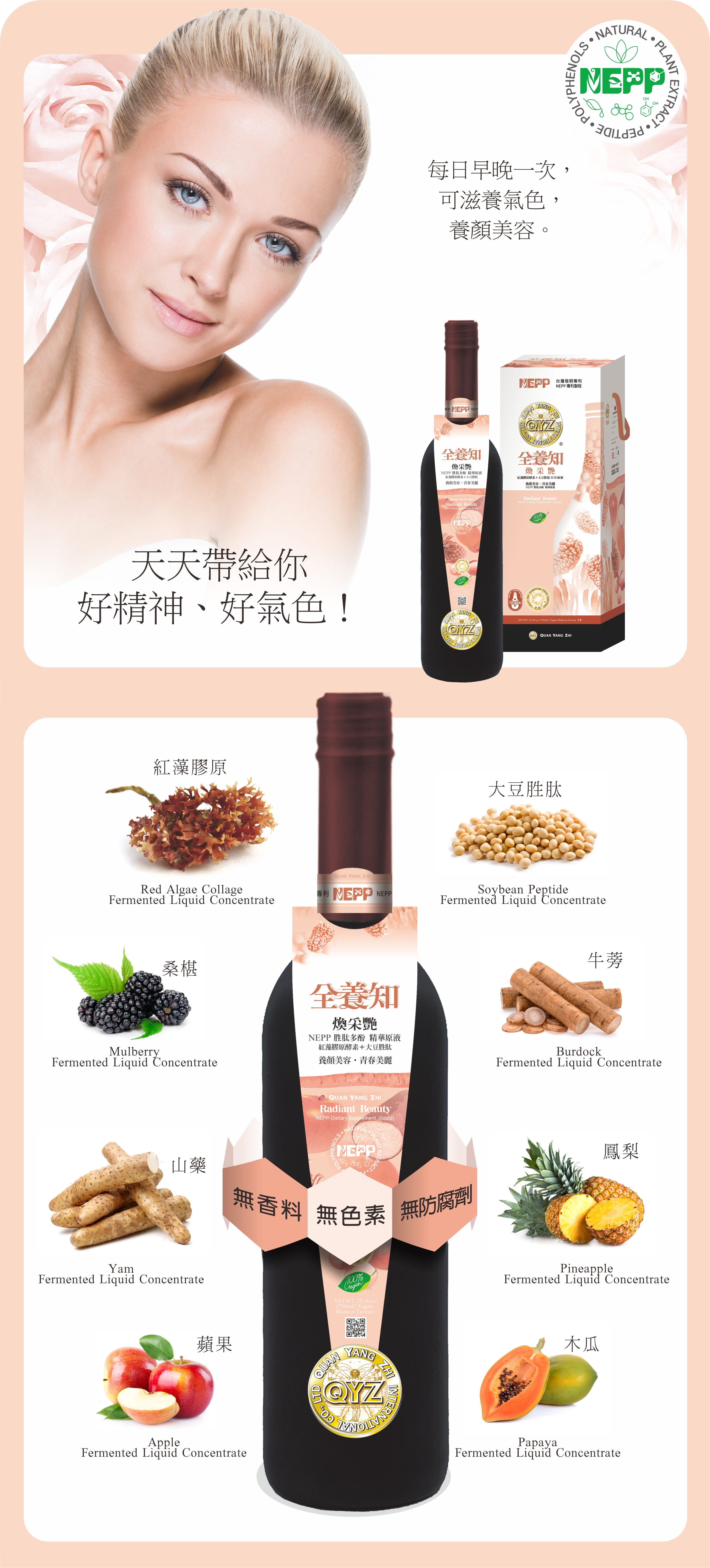 ●成分:紅藻膠原發酵液、大豆胜肽、桑椹發酵液、牛蒡發酵液、山藥發酵液、蘋果發酵液、木瓜發酵液、鳳梨發酵液、生機發芽糙米發酵液、植物性葡萄糖胺(玉米萃取)、異麥芽寡糖、植物性乳酸菌、酵母菌