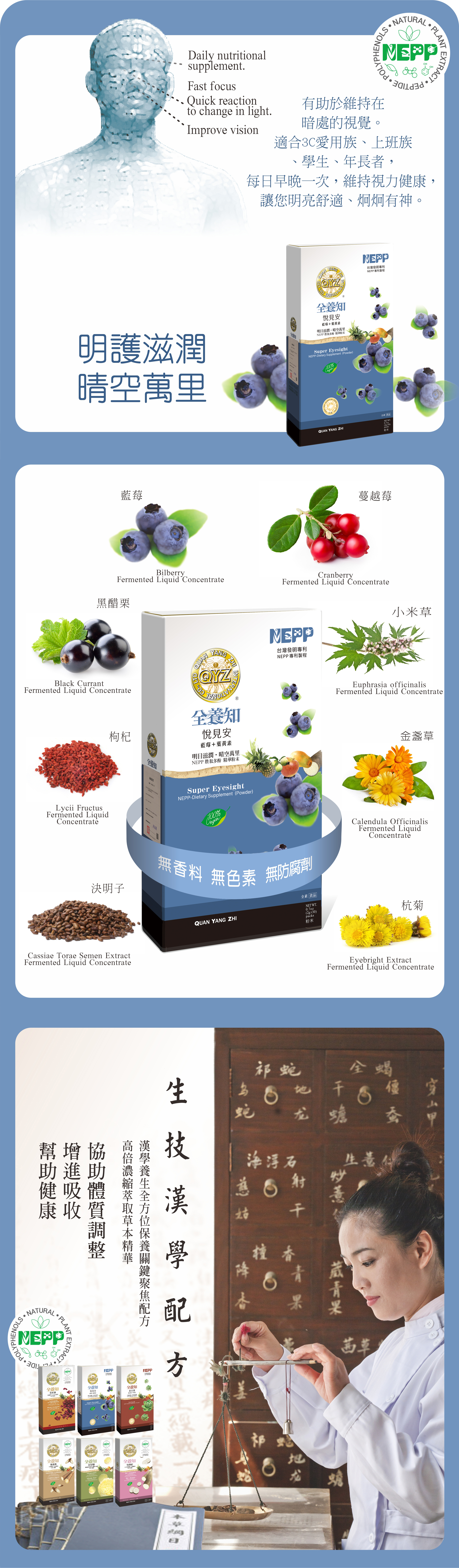 ●成分:藍莓發酵濃縮粉、黑醋栗發酵濃縮粉、蔓越莓發酵濃縮粉、枸杞發酵濃縮粉、決明子萃取物、金盞草萃取物(葉黃素)、小米草萃取物、杭菊萃取物、β-胡蘿蔔素(營養添加劑)、生機發芽糙米發酵濃縮粉、植物性乳酸菌、酵母菌